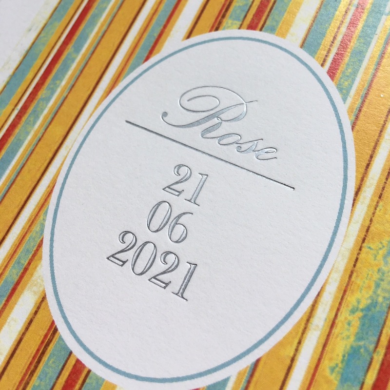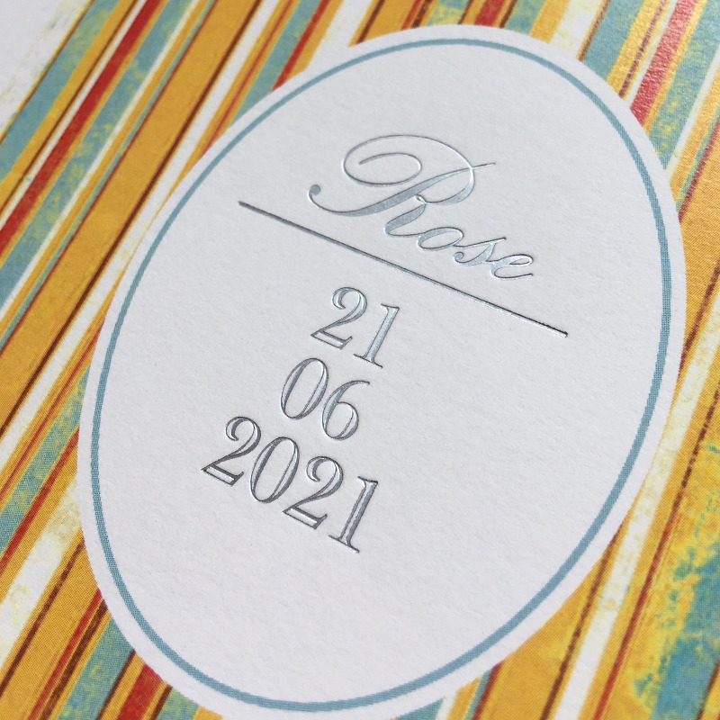 Dorure à chaud argent pour les prénoms et la date en couverture