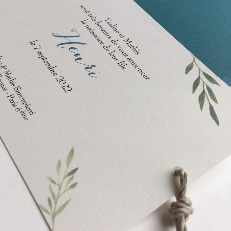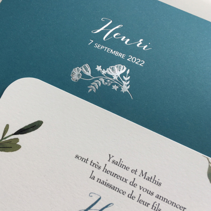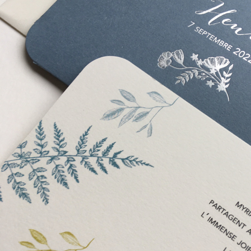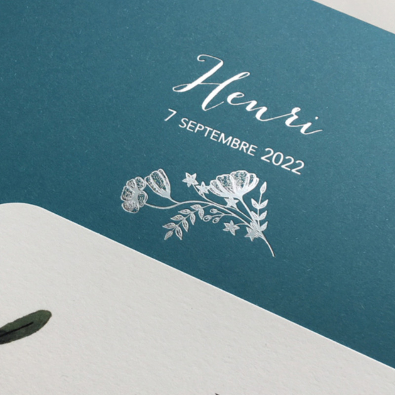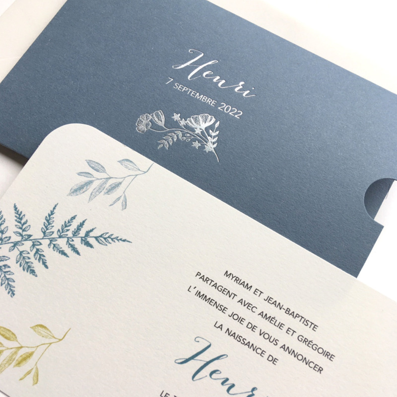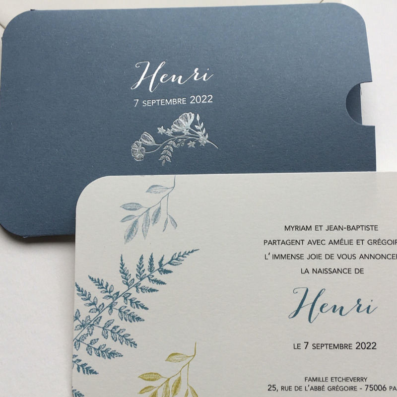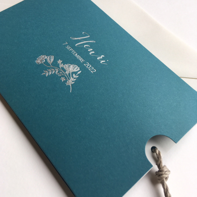 La Petite Baleine vous propose de personnaliser votre modèle en choisissant la couleur de votre pochette ainsi que la couleur de votre gravure or ou argent, les typographies et texte de votre faire-part.